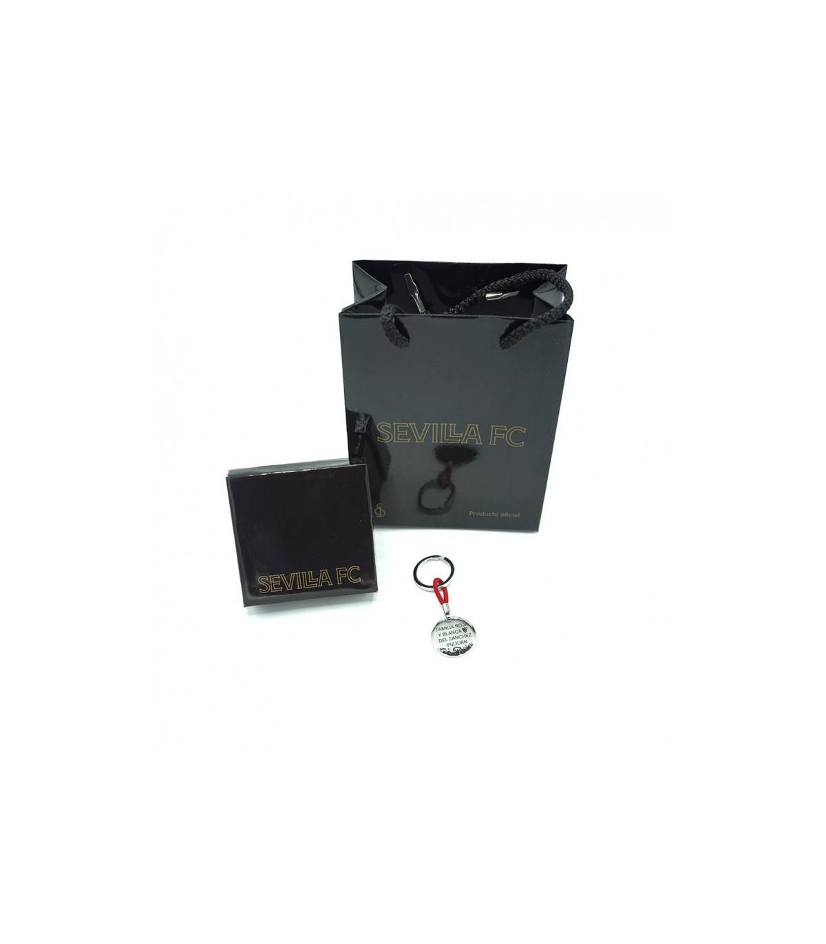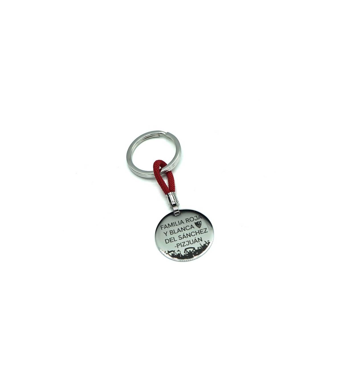Llavero de acero redondo plano, grabado a láser con el escudo del Sevilla Fútbol Club y la inscripción: “FAMILIA ROJA Y BLANCA DEL SÁNCHEZ PIZ-JUAN” y un dibujo de la afición abajo. Con un cordón rojo. Medidas placa: Ø 3.00 cm. Producto oficial que incluye caja, bolsa y etiqueta de autenticidad.