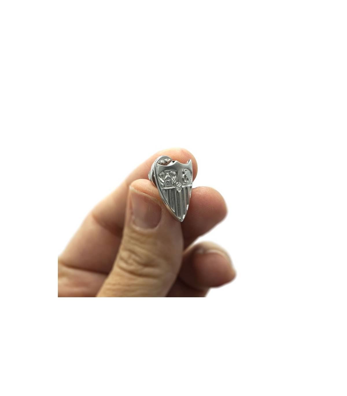 Pin de plata de ley. Diseño con el escudo del Sevilla Fútbol Club en relieve. Medidas: (1.60 x 1.90) cm (ancho x alto). Producto oficial que incluye caja, bolsa y etiqueta de autenticidad.