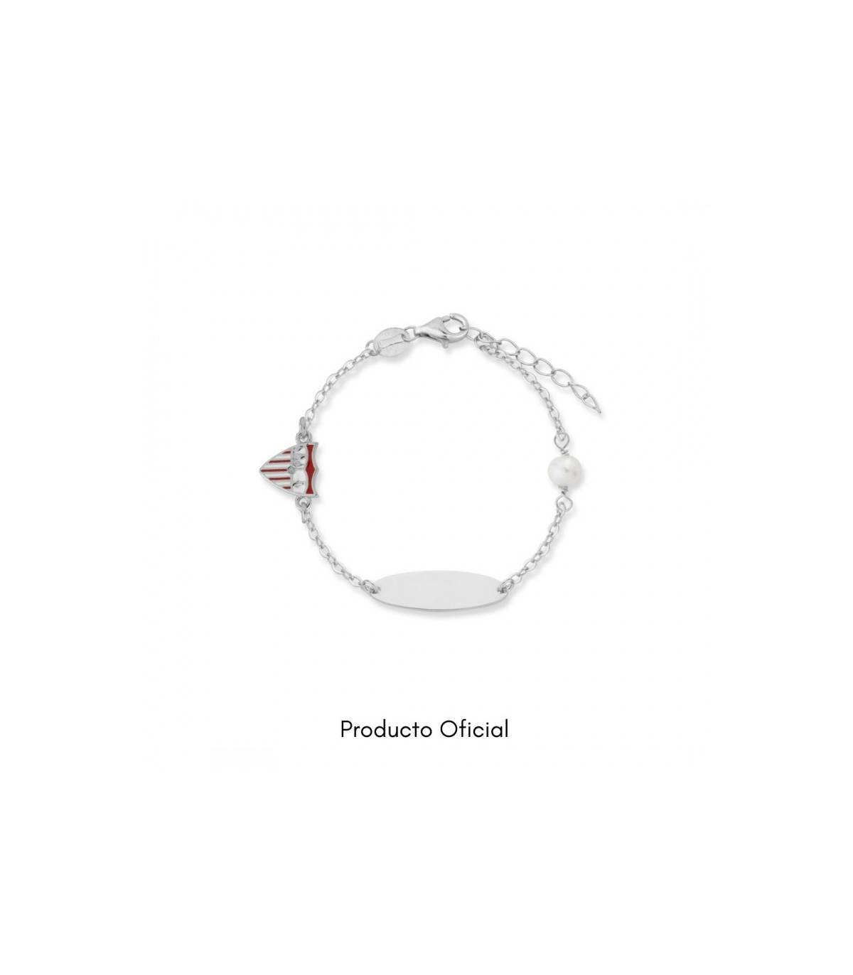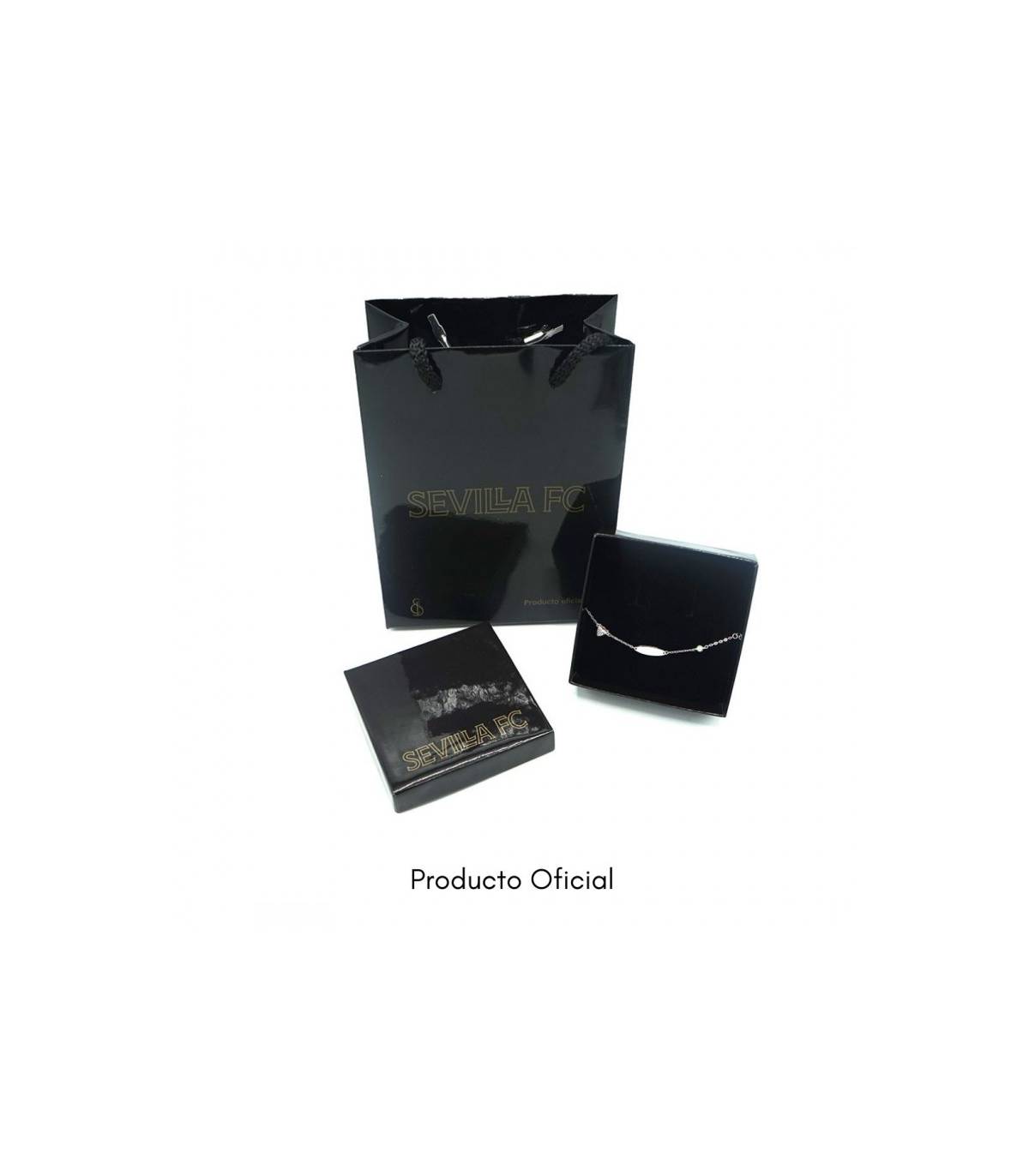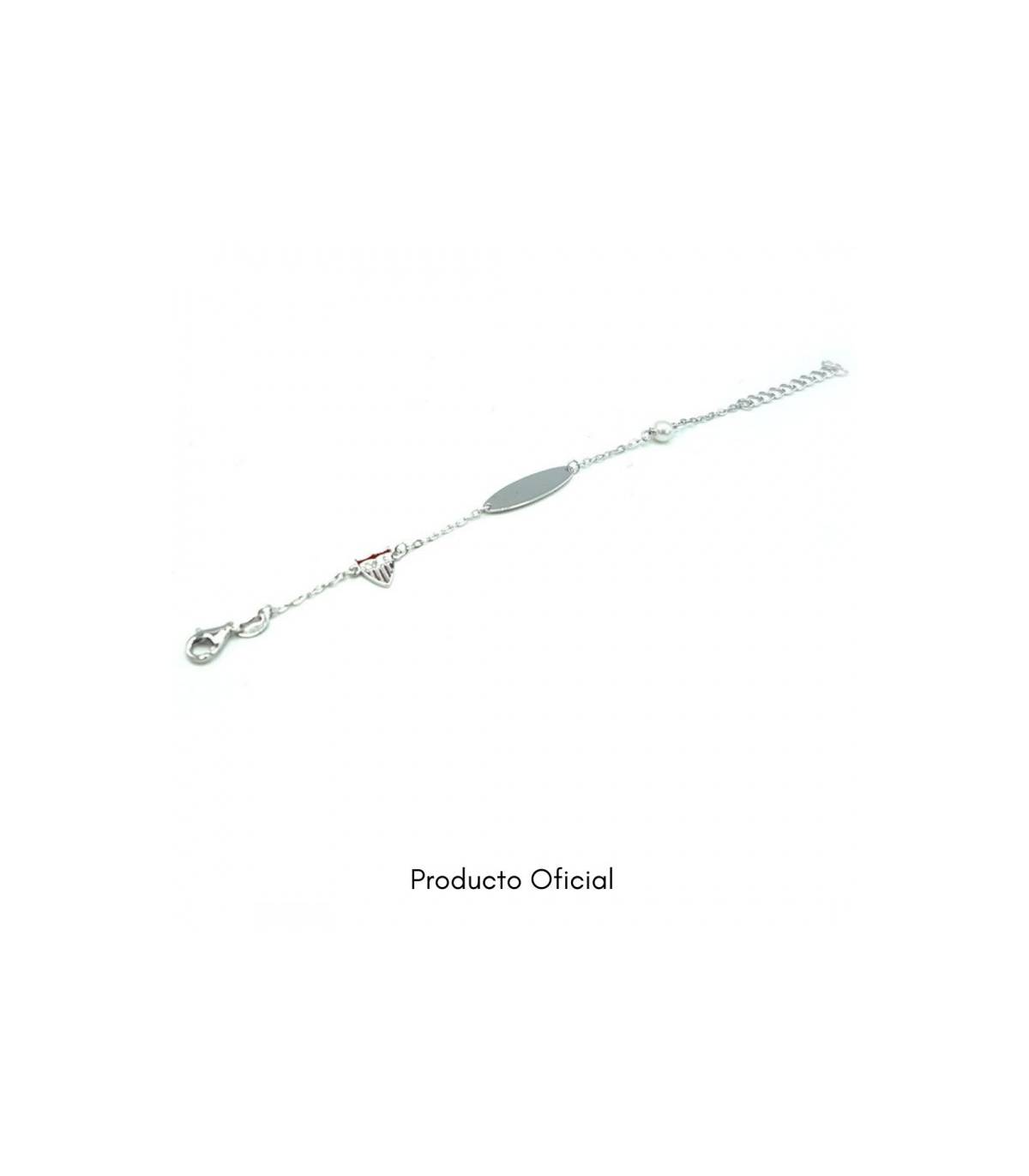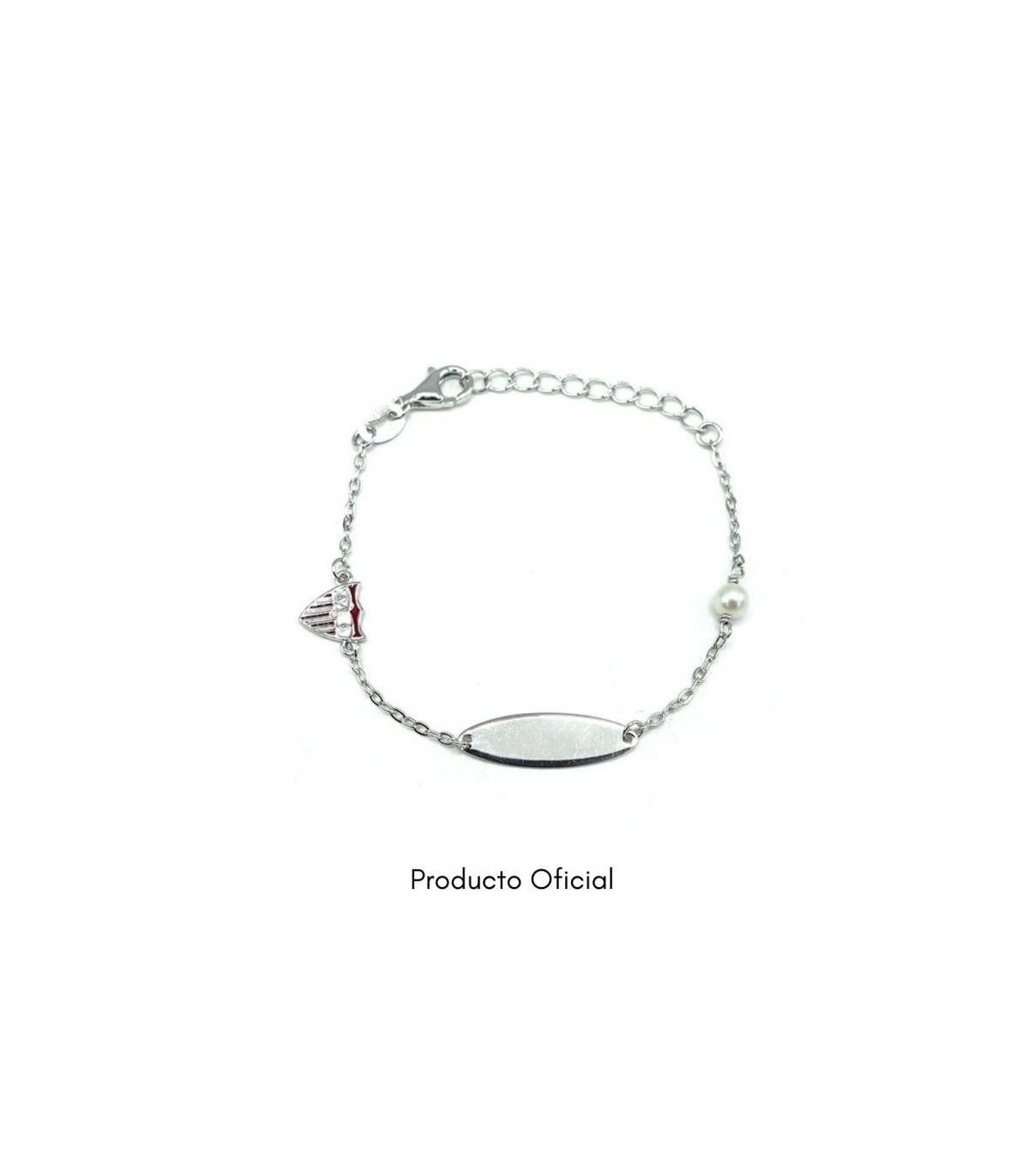 Pulsera de plata de ley con cadena fina y placa lisa ovalada para grabo personalizado en el centro, escudo del Sevilla Fútbol Club a color dispuesto en un lateral y una perla blanca en el otro lado. Cierre de mosquetón. Medidas placa: (1.80 x 0.50) cm. Longitud pulsera:  12 cm + 3 cm de alargador Producto oficial que incluye caja, bolsa y etiqueta de autenticidad.