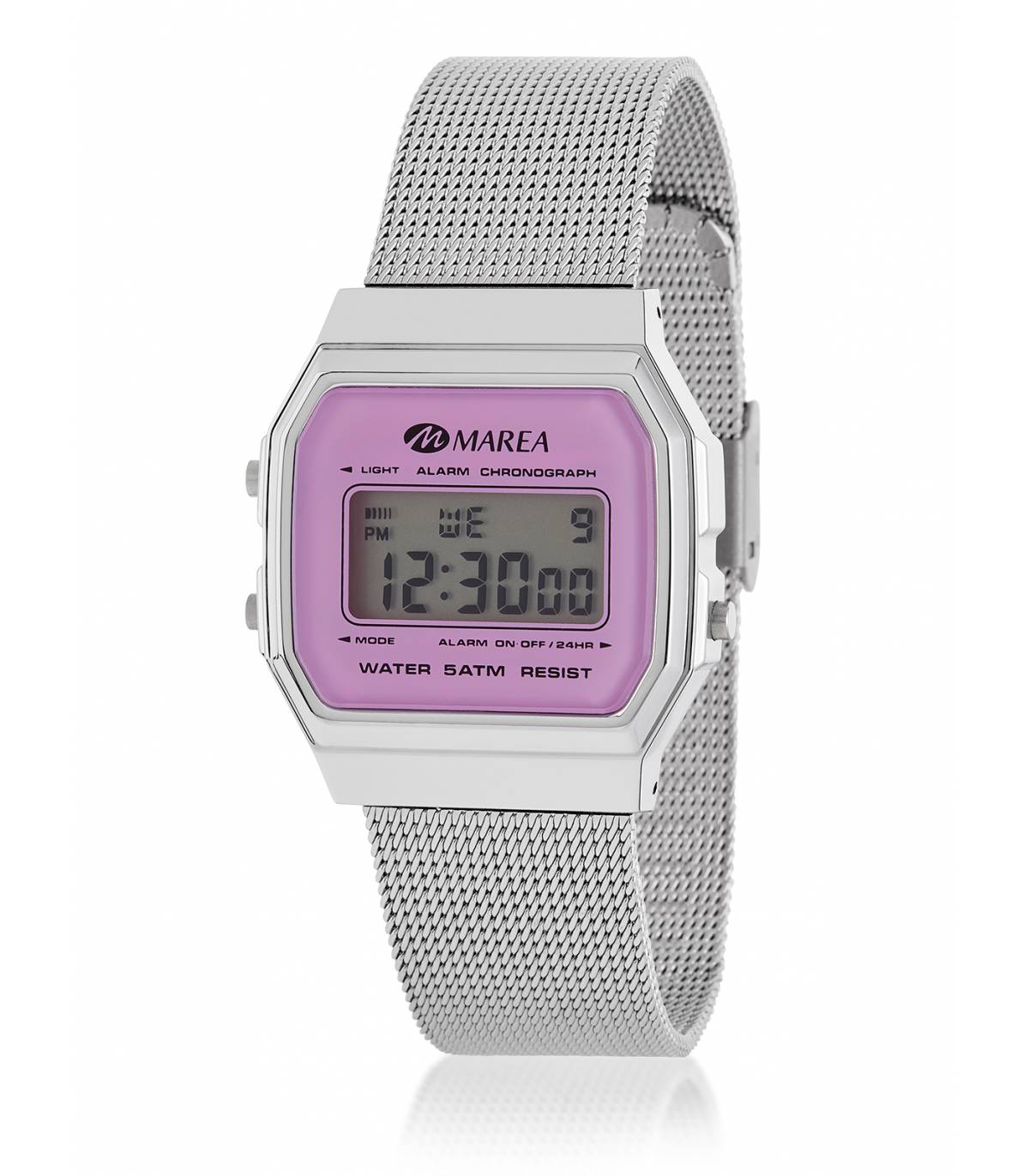 Reloj digital pantalla LCD color lila. Diámetro Caja: 34×39 mm. Material Caja: Plástico. Material Brazalete: Acero. Resistente al agua: 5 ATM.