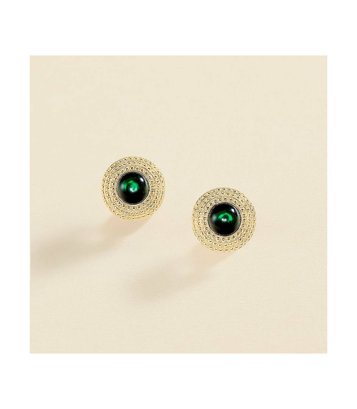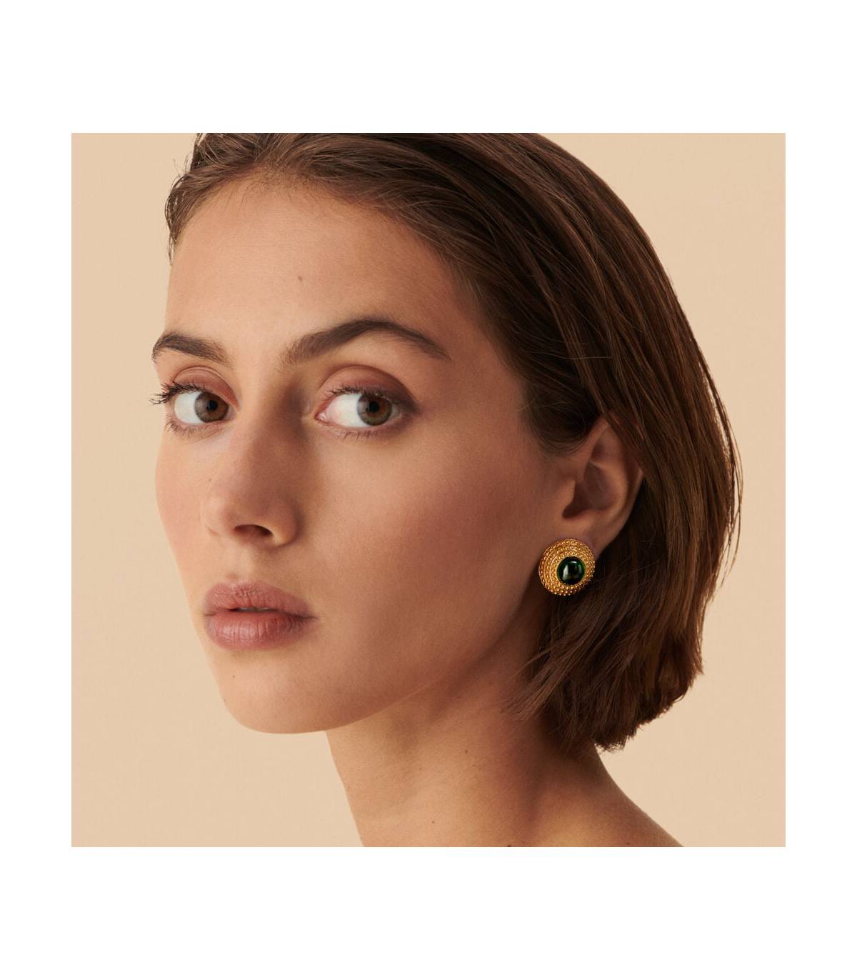 Pendientes de clip redondos acabados en oro con cabujón de color verde esmeralda. Si quieres conseguir ese aire parisino chic y effortless, estos son tus pendientes. La colección nº13 de María Pombo está inspirada en las joyas vintage más icónicas de Agatha Paris y no puedes quedarte sin ellas.