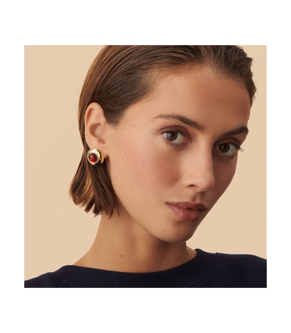 Pendientes de clip redondos acabados en oro con cabujón de color rojo carmesí. Si quieres conseguir ese aire parisino chic y effortless, estos son tus pendientes. La colección nº13 de María Pombo está inspirada en las joyas vintage más icónicas de Agatha Paris y no puedes quedarte sin ellas.