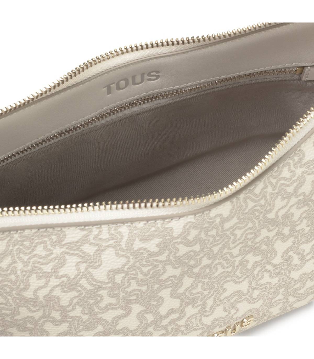 Bolso bandolera mediano TOUS City de poliuretano en color topo. Cierre de imán. Bolsillo exterior cremallera y bolsillo interior cremallera. Asa bandolera ajustable. Medidas (alto x ancho x fondo): 16 x 26 x 12 cm.