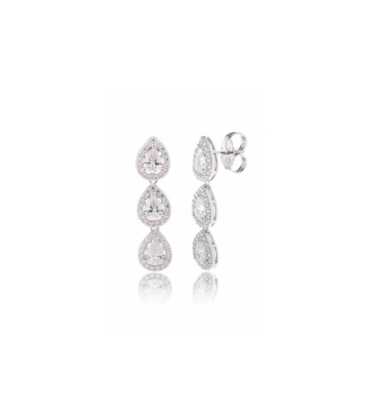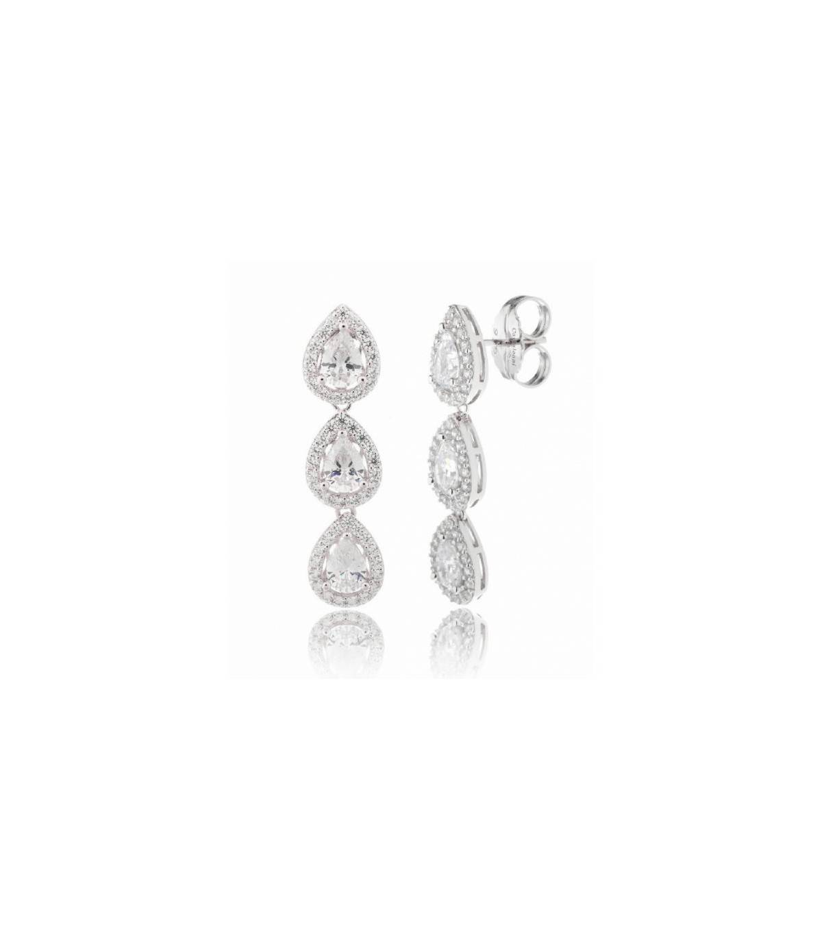 Pendientes de plata con tres circonitas talla lágrima cercadas por circonitas talla brillante, todas ellas calidad RS 'cupido' y RS 'multifacet'. Pendiente acabado con triple baño de paladio, platino y rodio o triple baño de rodium de gran resistencia y durabilidad.