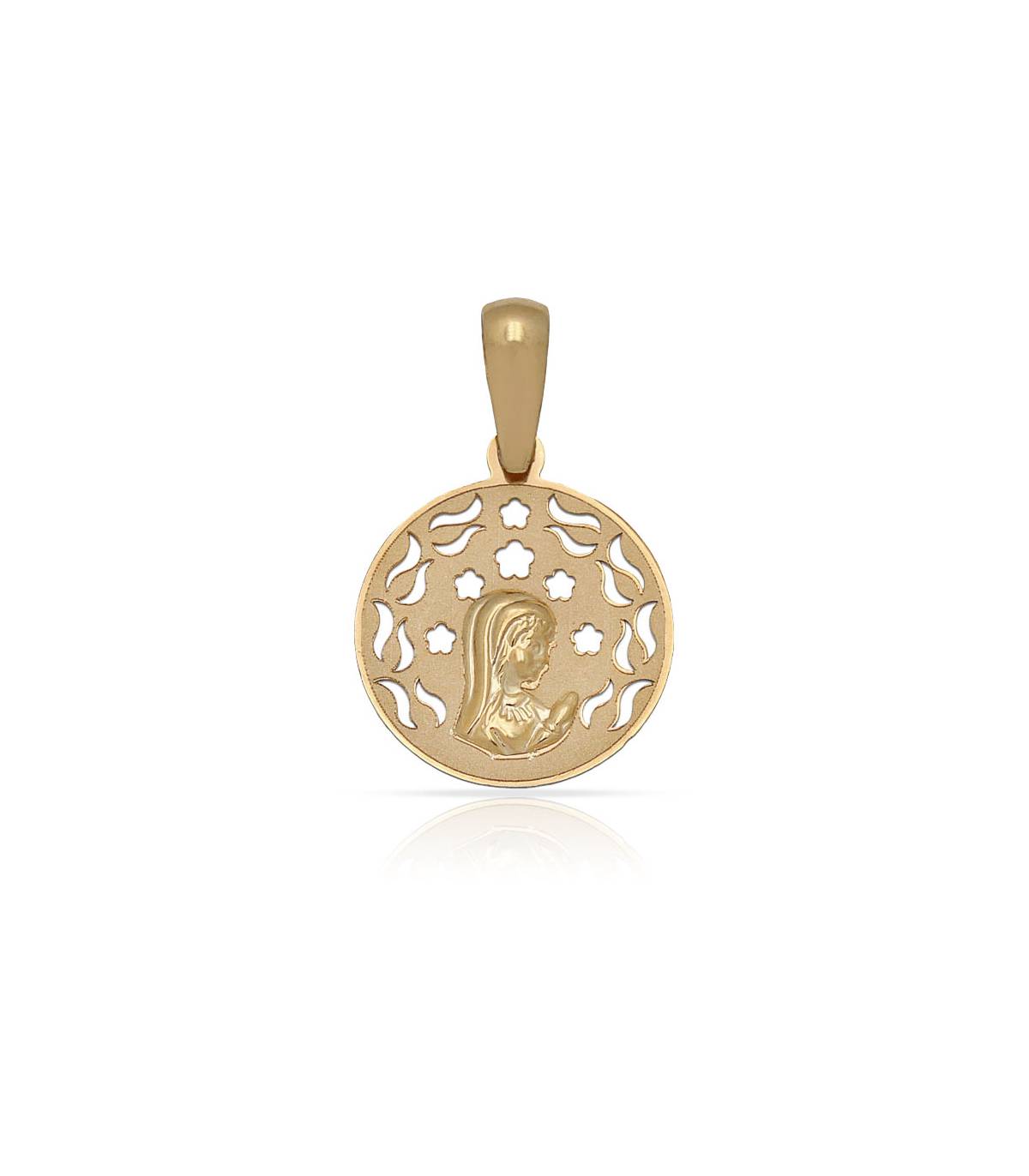 Medalla de la Virgen niña en Oro de 18 Kl. Centro matizado. Virgen y filo en brillo. Medidas de la medalla: 16 mm.