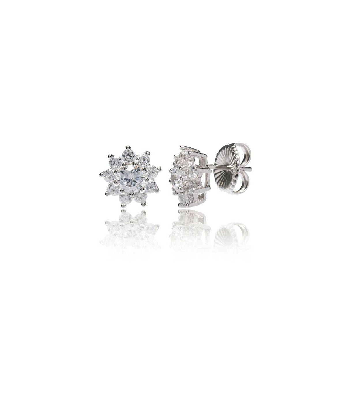 Te presentamos nuestros pendientes de plata modelo "Chambord". Una roseta montada en garra con cierre de presión, lleva circonitas calidad 5A RS en diferentes tamaños todas talla brillante. Pendientes de plata de ley, acabados en blanco. Un clasico imprescindible en nuestro joyero .Pendientes de plata de Ley 925. Acabado: y triple baño de paladio, platino y rodio o triple baño de rodium. Cierre: presión. Piedras: circonitas blancas calidad 5A RS. Circonita central de 5ml9 circonitas de 2.5ml Medidas: 11.6ml de diametro.