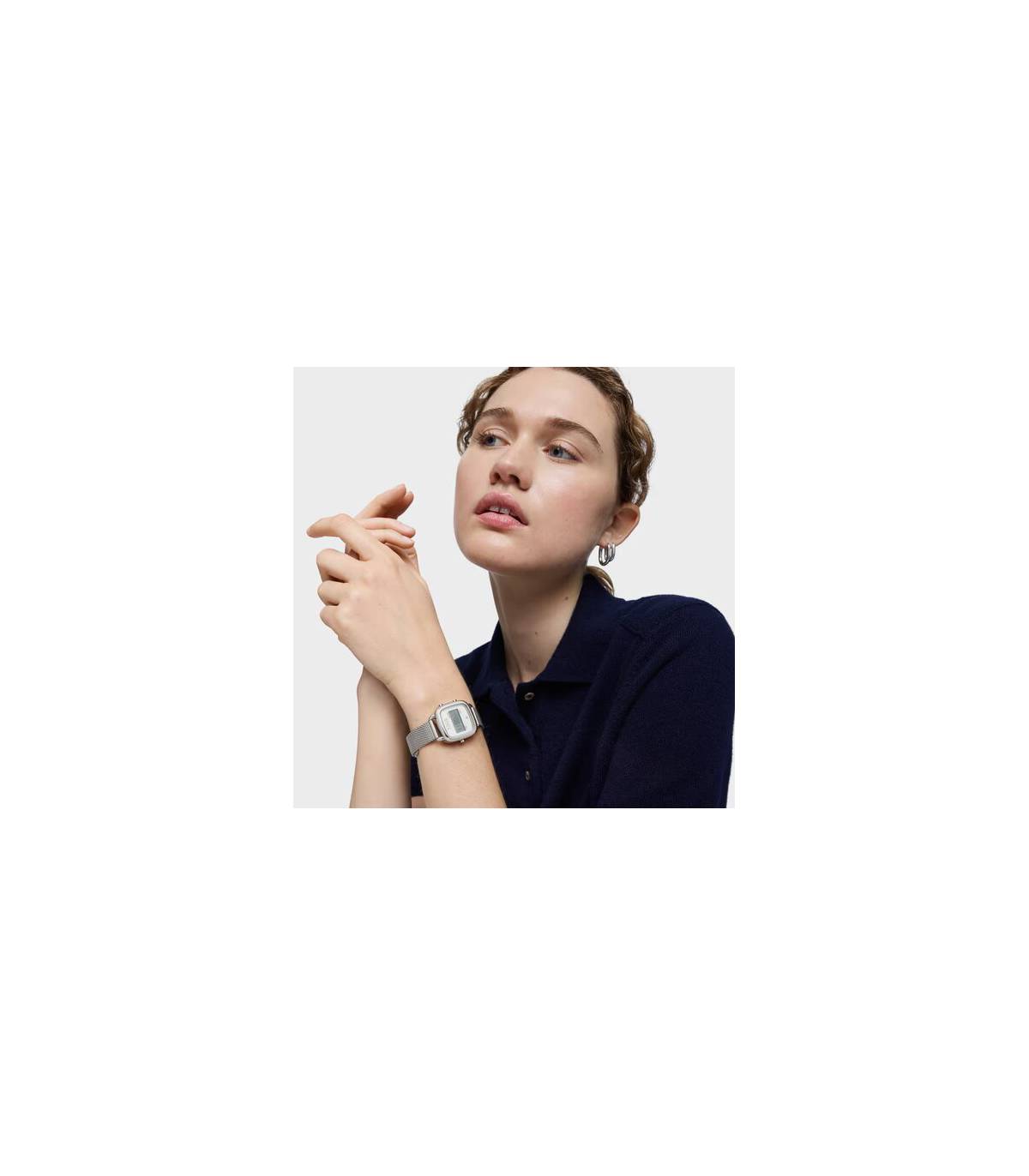 Reloj digital TOUS D-Logo Mini con brazalete de acero inoxidable. Funciones: hora, minutos, segundos, día, mes, día de la semana, cronógrafo 1/100 segundos y alarma. Impermeable a 5 ATM.